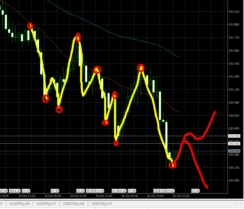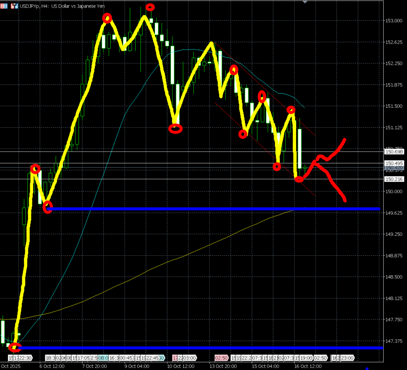 環境認識: 1,4時間足とも安値更新での下目線継続、4時間足の高値を付けたときの起点(青)の節目を目指す。最終的には窓空きも埋めてくるのでは(政治的要因あり)