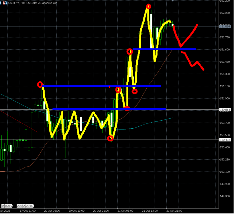 環境認識: 4時間足は上目線で3波を形成中、1時間足も上目線だが勢い失いつつ。1時間足でトレンド転換か。