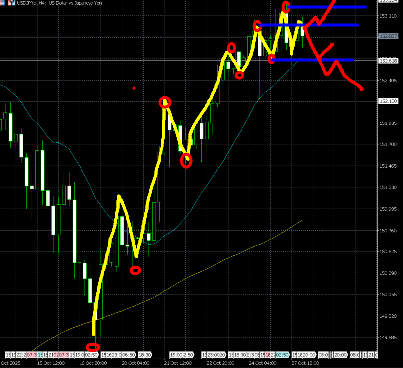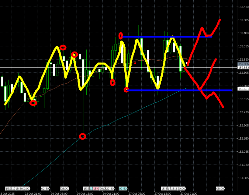 環境認識: 4時間足の節目が不明瞭です。高値を切り下げ上昇トレンドが失われつつあるようだ。1時間足も方向性を失っております。
