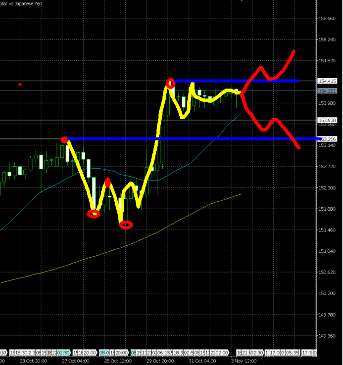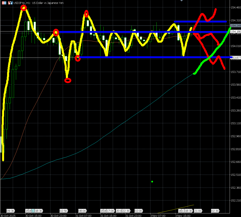 エントリー戦略: 1時間足のレンジ抜けを実体で確認して、エントリーして4時間足の節目を実体で抜けなければ撤退。