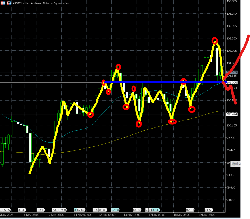 エントリー戦略: 4時間足の節目での押し目買い、高値更新するかは微妙です。