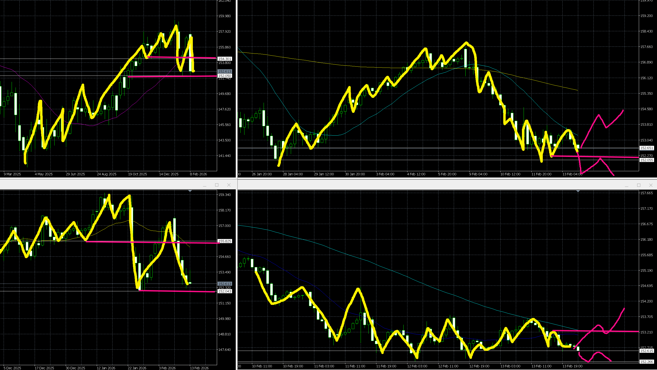 環境認識: 週足、日足、4時間足、1時間足とも下目線です。週足の節目で強く意識されて戻されています。4時間足、1時間足とも下方向を意識しつつ,日足20SMAまでの買い戦略ありか。